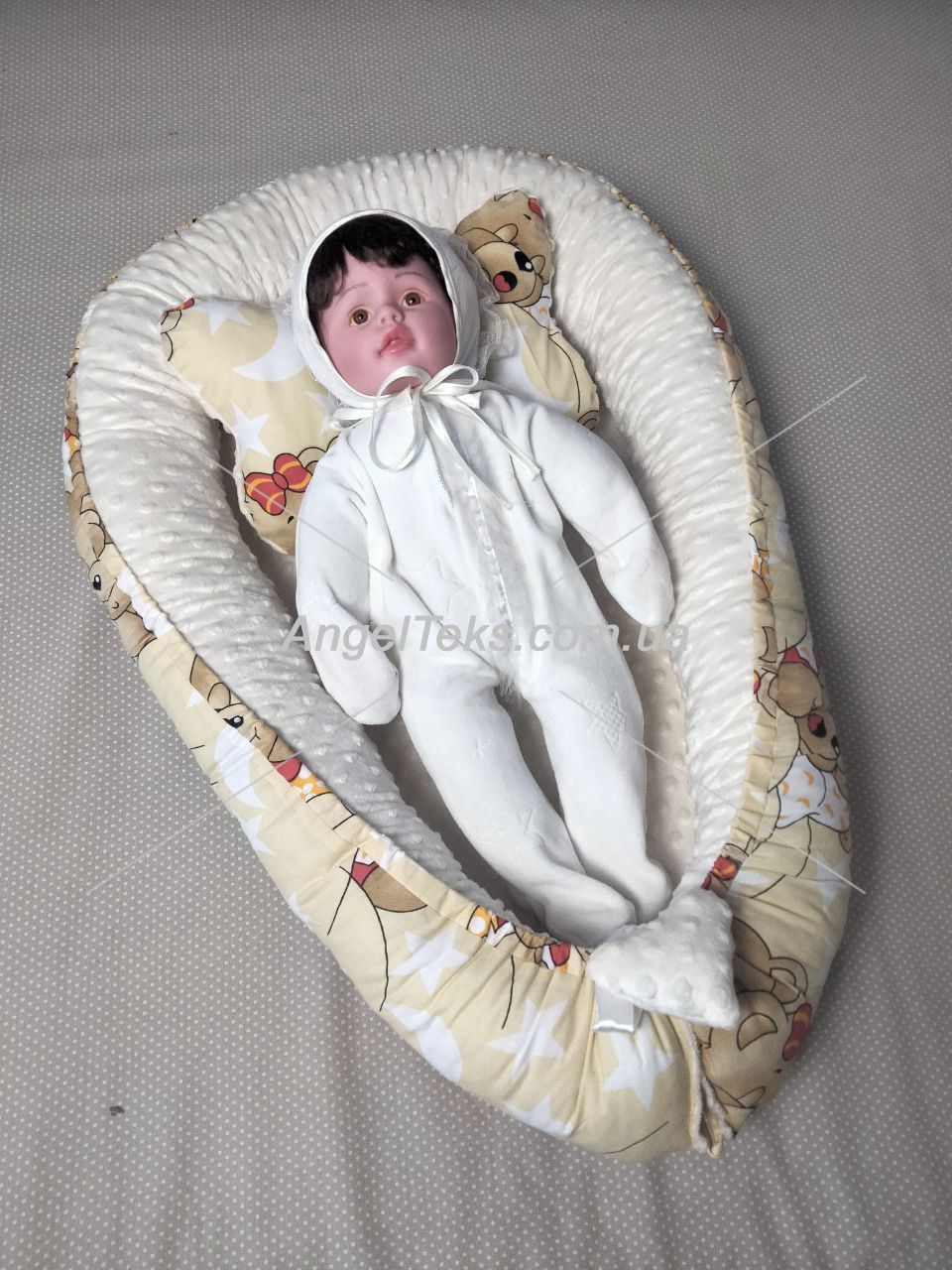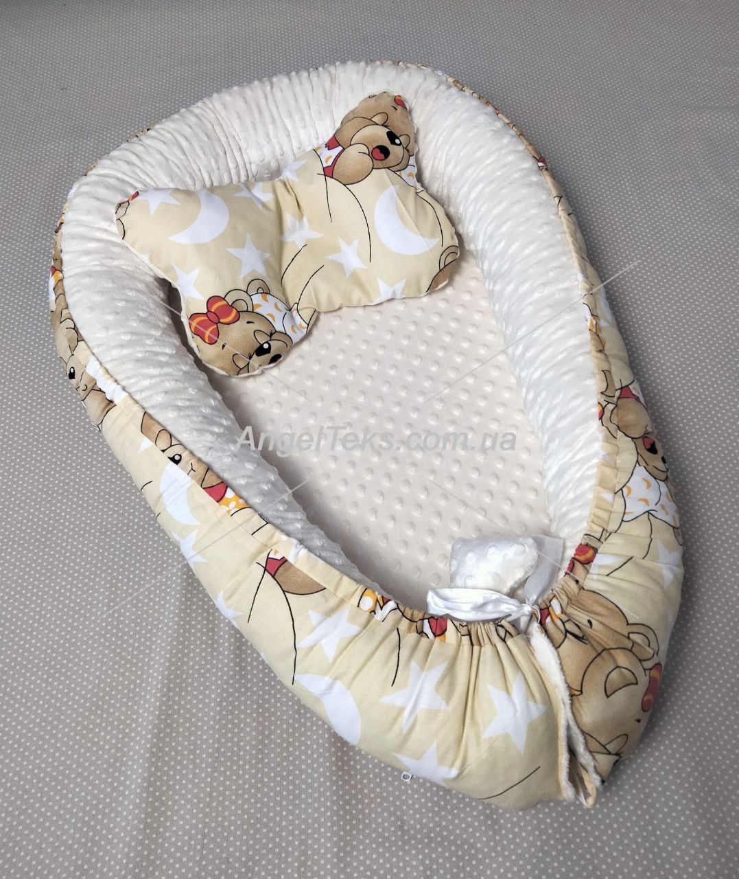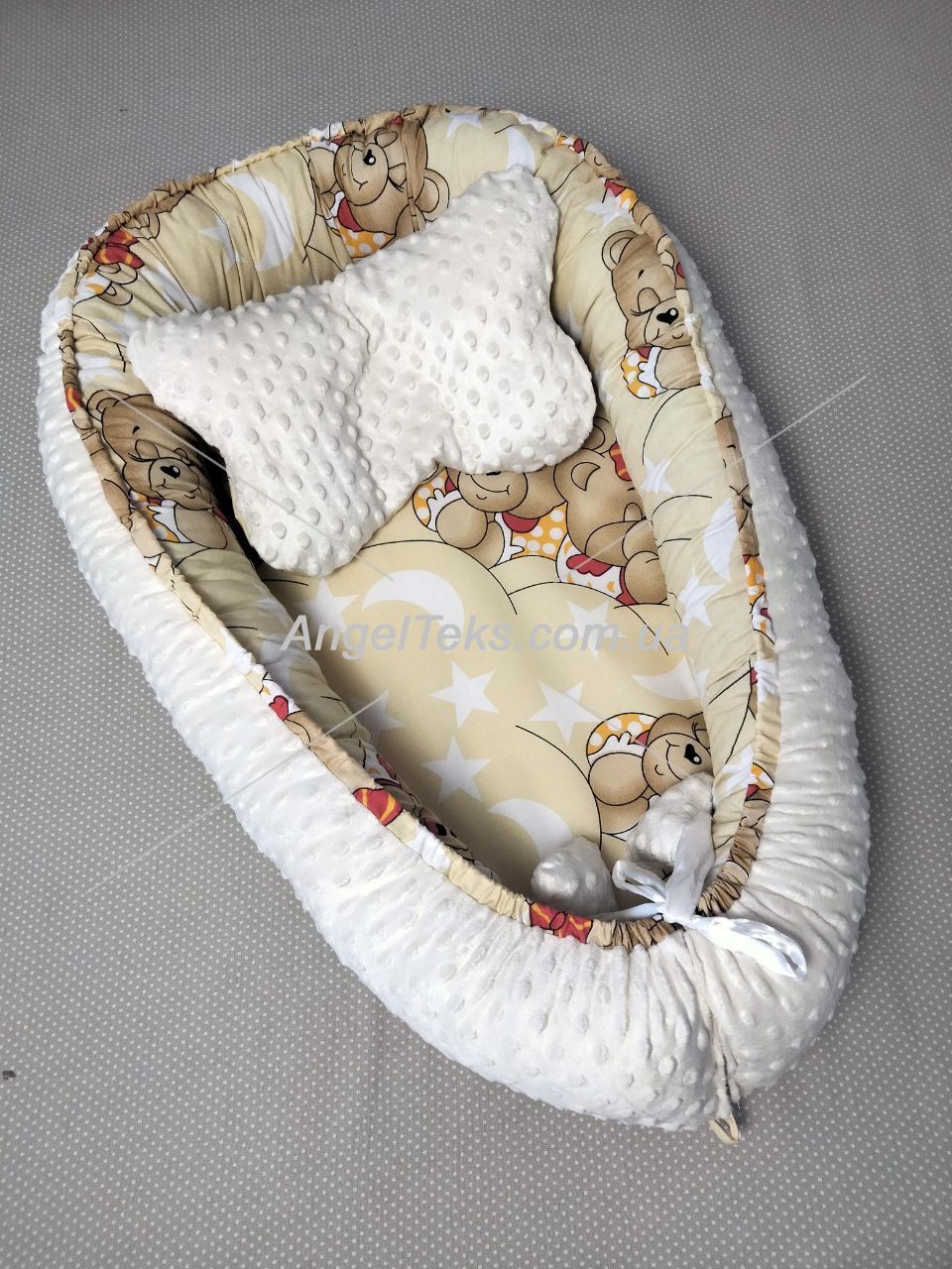 Дитячий кокон двосторонній "Трансформер" - "Ведмедики" + Молочний плюш, скомбінований.